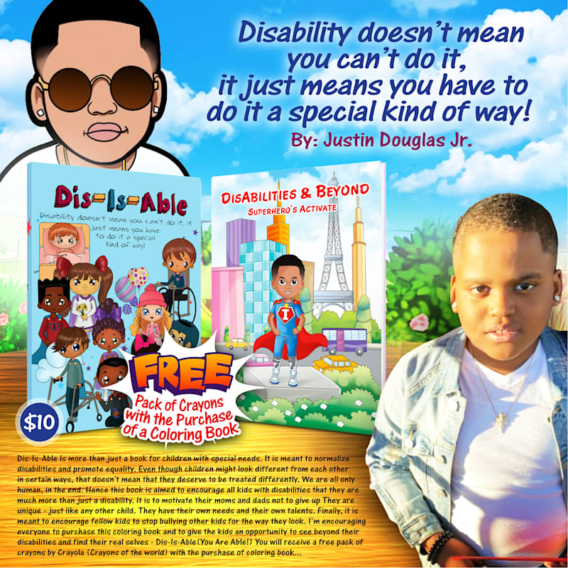 Dis-Is-Able Is more than just a book for special needs children. It is used to normalize and add beauty to disabilities! Even though children may look different doesn’t mean they should be treated differently. They may be capable of doing things that we do, just differently. This activity book is being used to encourage all kids, even kids with disabilities, that beyond a disability, we are all beautiful! We are all uniquely made. We are also encouraging typical kids to view special needs children by their abilities, not their disabilities. It is highly encouraged for everyone to purchase this coloring book, giving kids the opportunity to see beyond disabilities and find the beauty in it! The Dis-Is-Able(You Are Able) coloring and activity book will be provided with a free pack of crayons (Crayons of the World) with the purchase of coloring book. Remember we all are beautiful, in our own unique way!